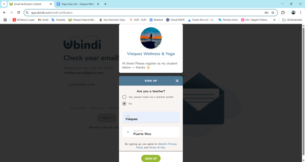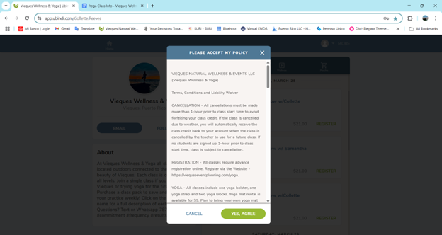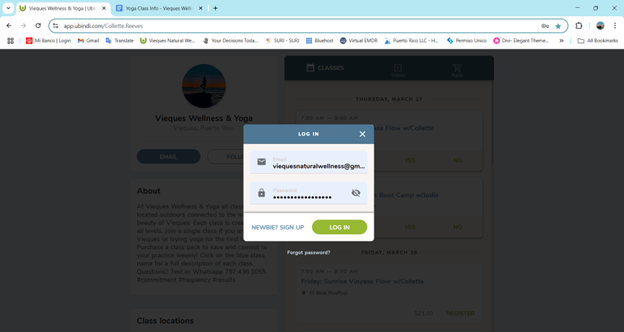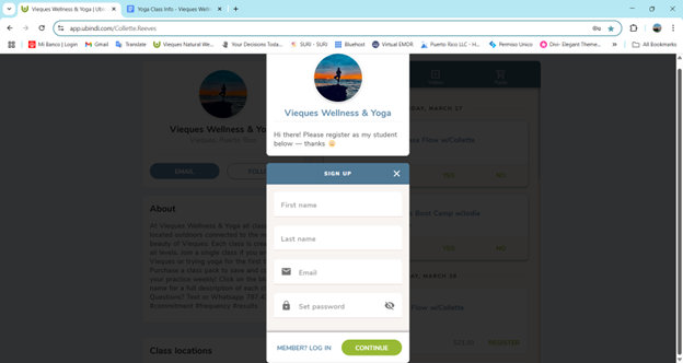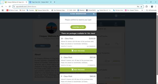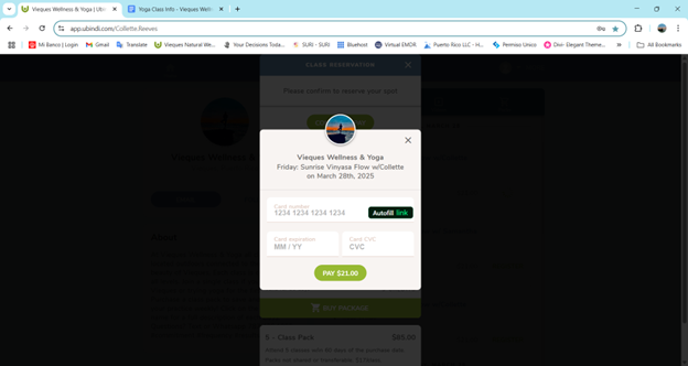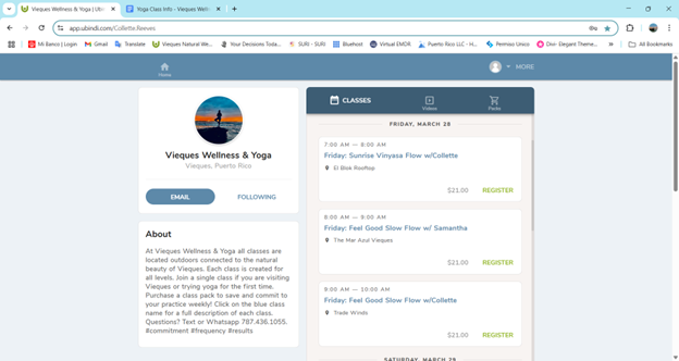 To book a yoga or fitness class – Follow the URL https://viequeseventplanning.com/yoga