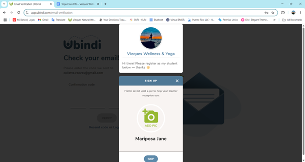 Click RESERVE CLASS button – This takes you to the Ubindi booking site (https://app.ubindi.com/Collette.Reeves ).