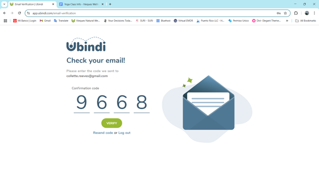 Check email to find verification code. Enter code and click verify to proceed.